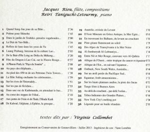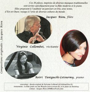 Joint au livre dans ce package, le compact-disc “d’Orient en Occident” regroupant 36 pièces (Jacques Riou [flûte], Reiri Taniguchi-Letourmy [piano], Virginie Collombet [textes]….Une belle mosaïque sonore que nous propose le compositeur Jacques Riou !